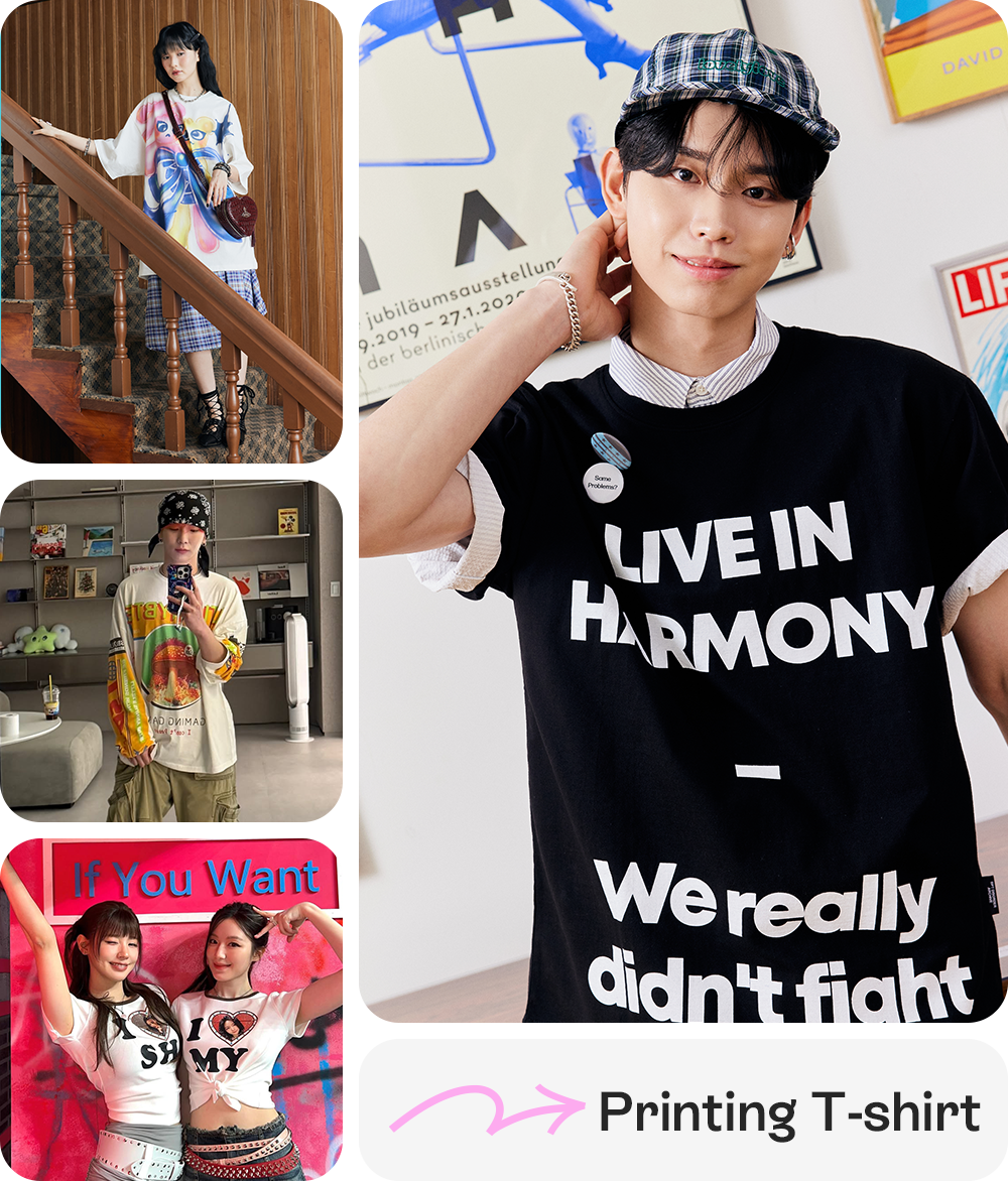 ఎ 굿즈 티셔츠는? 디지털 프린팅 디지털 프린팅은 그래픽 파일📂을 입력하면 그대로 옷 위에 인쇄돼요. 복잡한 그래픽이든, 휴대폰으로 촬영한 사진📷이든 그대로 티셔츠에 인쇄할 수 있어요. 인쇄판이 필요 없어 소량 제작에 적합하고, 컬러 제한도 없습니다. 다만 선명하고 진한 색감보다는 인쇄한 듯한 질감이 눈에 보이고, 내구성은 다른 방식보다 떨어져 주로 빈티지한 무드에 활용됩니다.