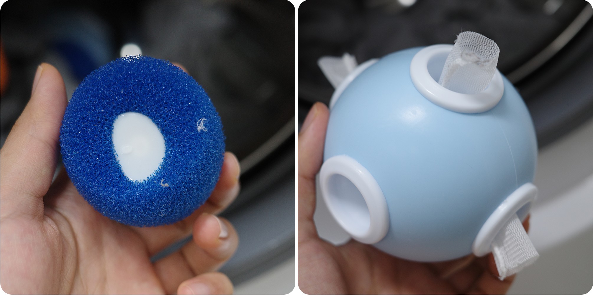 ఎ 세탁거름망 vs 세탁볼 먼지를 일일이 제거하기 전에, 세탁기 안에서 어느 정도 걸러지고 나오면 좋겠다는 생각이 들었어요. 그래서 선택한 건 바로 세탁거름망과 세탁볼! 대부분의 세탁거름망은 통돌이 세탁기 전용이라, 드럼 세탁기에서도 쓸 수 있는 제품을 찾았죠. 그게 바로 바디홈 프리미엄 세탁거름망이었어요. 말랑하다는 후기도 있었지만, 실제로는 누르면 살짝 들어가는 단단한 플라스틱 느낌이에요. 같이 구매한 오너백 엉킴방지 먼지제거 세탁볼도 함께 넣고 세탁기를 돌려봤습니다. 두 제품 모두 반신반의했는데, 실제로 먼지와 실밥이 꽤 잘 붙어 나왔어요. 둘 중 추천하는 건 단연 세탁볼! 세탁거름망은 6개의 구멍을 일일이 열어 비워야 했지만, 세탁볼은 얼마나 묻어 나왔는지도 눈으로 바로 보이고👀, 꺼내서 물에 헹구기만 하면 돼서 더 간편했어요. 실제로 먼지도 세탁볼에 더 많이 묻어나왔고요👏. |