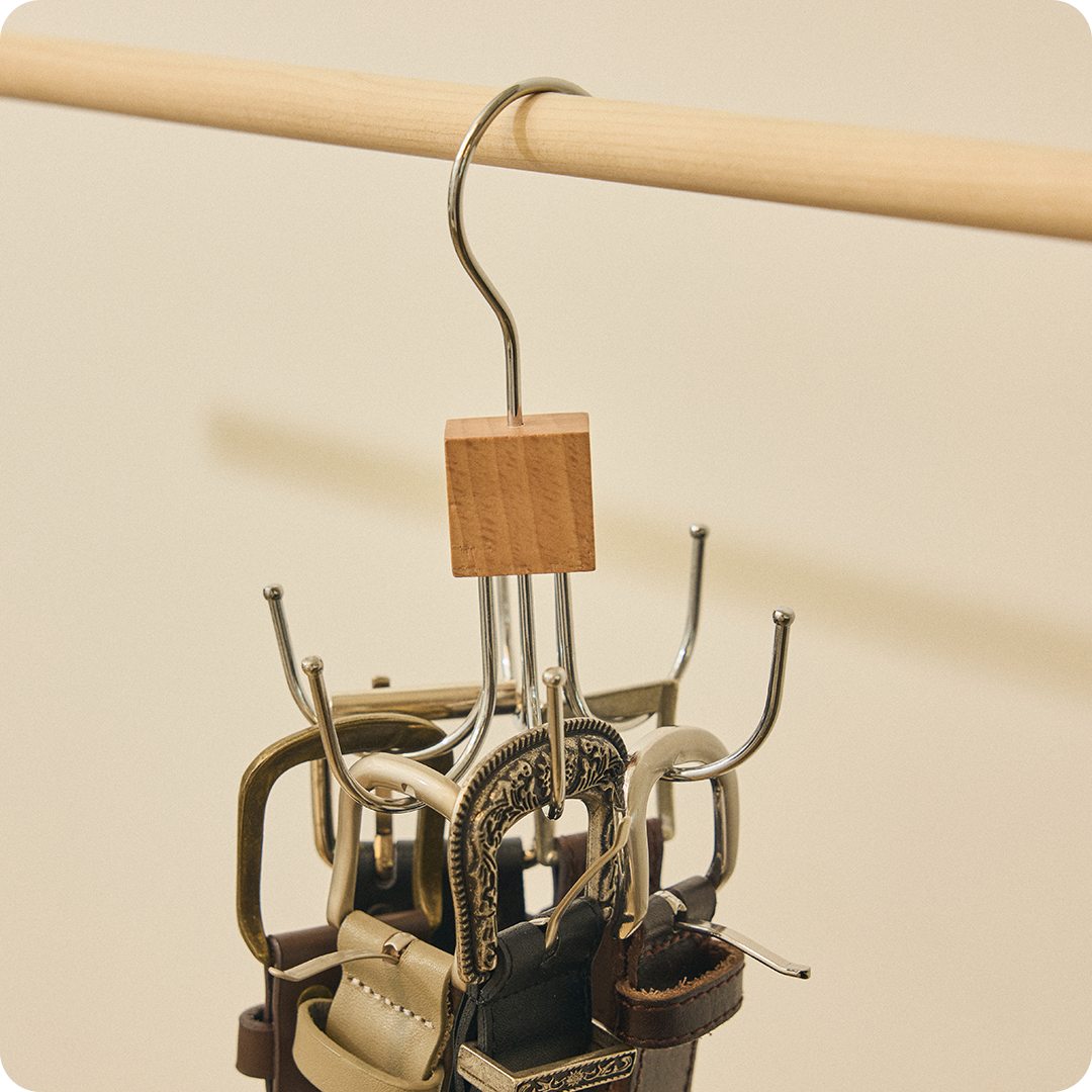 ➌ 보관형 vs 걸이형 벨트 끝부분을 버클에 끼워 고리를 만든 뒤, 전체를 돌돌 말아 넣어주면 예쁘게 고정돼요. 쉽게 이해할 수 있도록 에디터가 영상(클릭🎥)을 준비했어요. 정리한 벨트를 아크릴 정리함🧺에 넣으면 공간 활용도 완벽! 옷장이나 행거에 걸어 보관하고 싶다면 벨트 수에 따라 벨트걸이를 선택해 보세요. 5개 이하라면 회전형 벨트걸이를, 10개 이상이라면 일자형 벨트걸이를 추천해요.